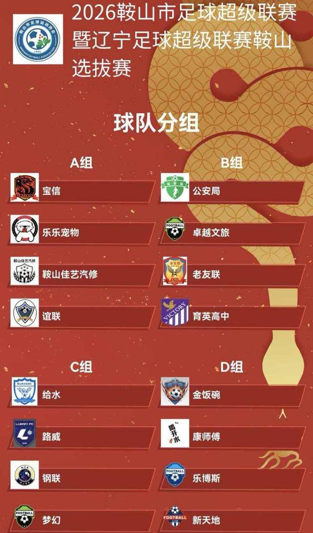 本次比赛由鞍山市足球协会主办,吸引了全市300余名足球爱好者踊跃报名。参赛球员年龄跨度从16岁到45岁,充分体现了鞍山民间足球的广泛参与度和深厚群众基础。抽签仪式于当天上午10点开始,各队代表依次抽签,最终分组结果如下: