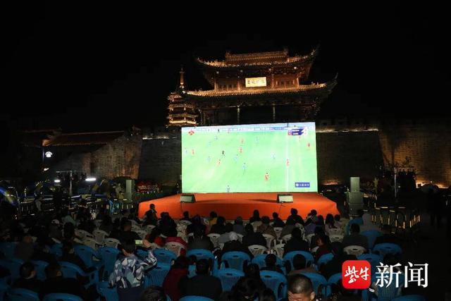文旅特色点位亮点独具,平日里淮音悠扬、水袖翩飞的九龙口淮剧小镇沙庄戏苑,当晚响起阵阵“球进啦”的欢呼。古戏台前大屏直播绿茵对决,传统戏曲文脉与现代足球激情跨界融合,让小镇既有韵味更具活力。