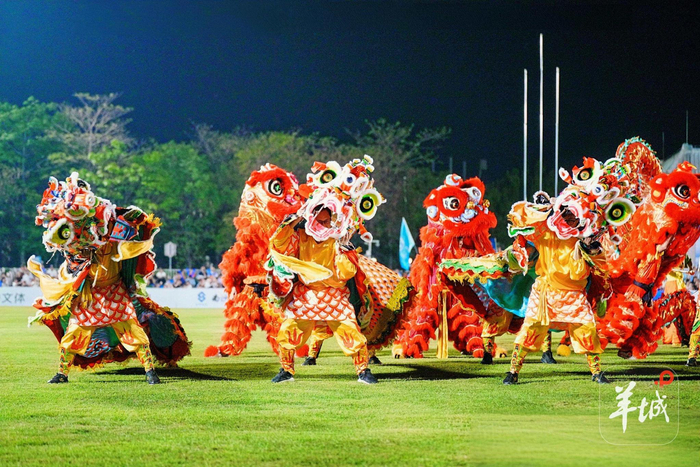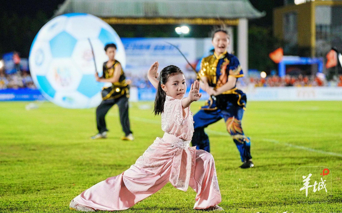 开幕式的入场环节开始前,场内先进行了多轮暖场表演。古今足球技艺展示《蹴往足来》呈现了从传统蹴鞠到现代足球的传承脉络,港科大Half Half乐队的动感旋律与东涌中学的青春街舞率先点燃气氛,随后《真我风采 武动绿茵》以刀枪剑棍拳精彩演绎,《飞鸿志·中国心》则在大井龙狮麒麟团与黄飞鸿非遗功夫龙狮团的配合下,将国家级非遗醒狮与传统武术巧妙融合。