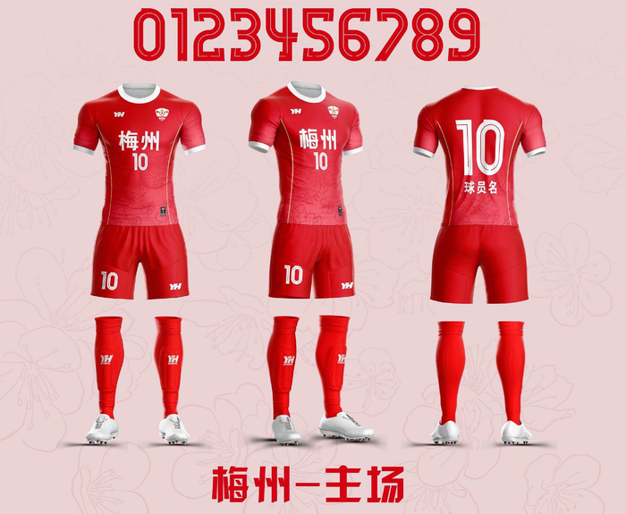主场球员球衣以梅州的城市精神与文化根脉为核心。以梅为魂,致敬市花,以梅花“傲雪凌霜、坚韧不拔”的品格,致敬梅州足球人在赛场上永不言弃、顽强拼搏的精神,更承载了客家人崇文重教、刚毅自强的城市底色。颜色采用梅花红色,领口与袖口的白色撞色包边,如同梅花的白瓣点缀,让整体造型更具活力与层次感,同时在赛场上形成鲜明视觉识别,彰显球队的精气神。