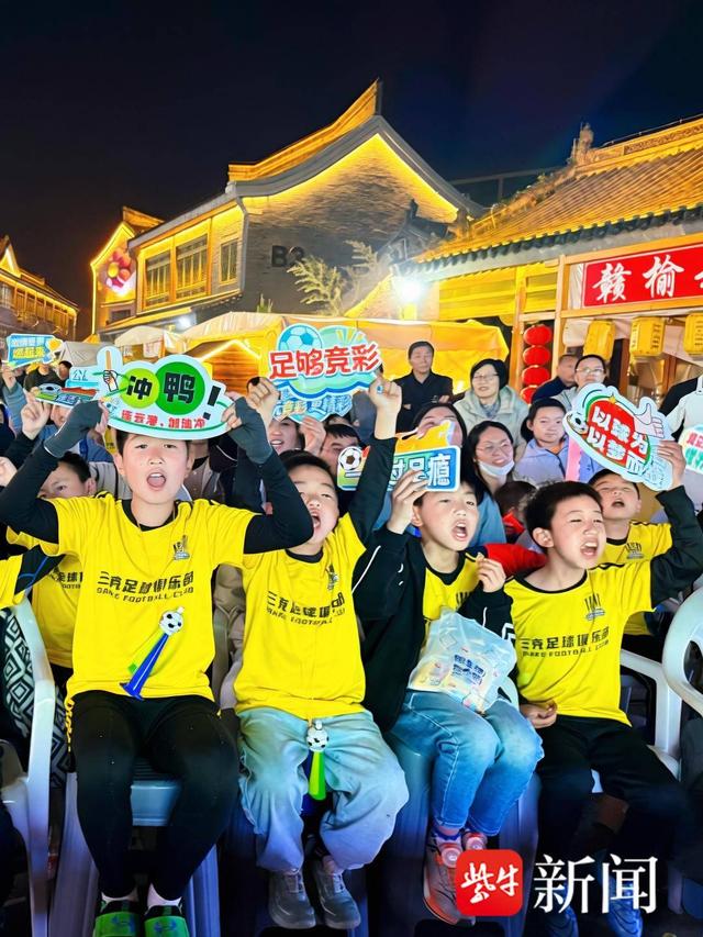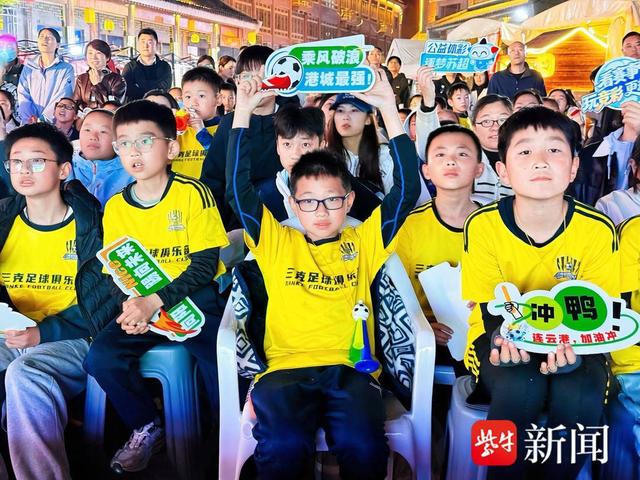 热闹的人群中,三克足球俱乐部的50余名小球员身着统一队服,手持“冲鸭!”“乘风破浪 港城最强!”“向阳启航 踢向未来”的应援手牌,整齐列队、精神饱满,为一道亮眼的青春风景线。从球员热身、传球到攻防转换,小球员们目不转睛、满脸紧张,稚嫩又响亮的喝彩声响彻街巷,为现场增添了满满活力。“特意带领孩子们来到现场,感受职业足球赛事的浓厚氛围。”三克足球俱乐部教练陈家旭表示,苏超联赛赛事水平高、对抗节奏快,能让孩子们直观感受足球魅力,引导更多孩子爱上足球、踢好足球,为赣榆足球储备后备力量。”