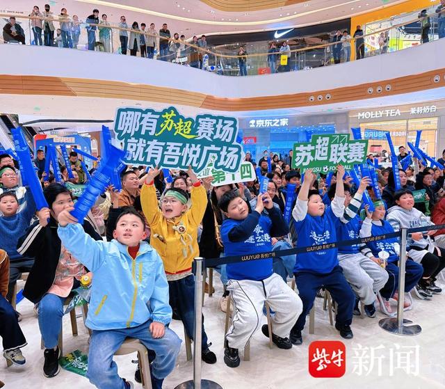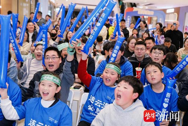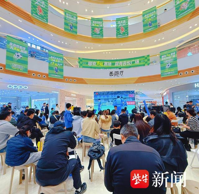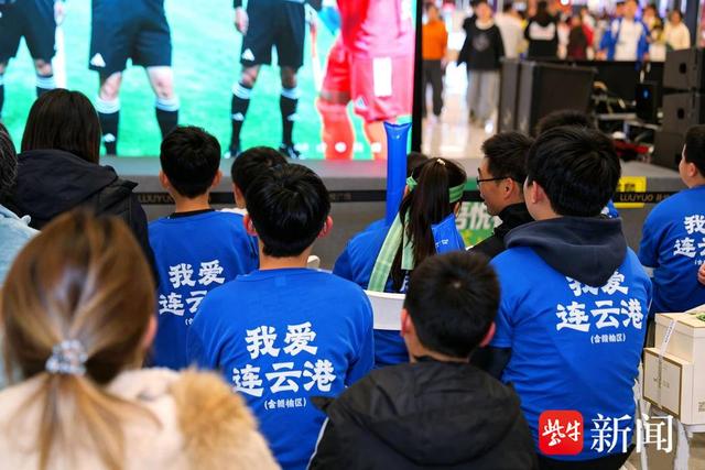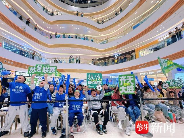另一边,连云港市赣榆吾悦广场西游厅内同样热度爆棚!作为苏超重要观赛点,商场精心打造沉浸式观赛场景,高清大屏实时直播赛事进程,“吃港城海鲜 争苏超之巅”“来吾悦看球 为苏超加油”的标语随处可见,年轻球迷、学生党们穿着蓝色定制服饰,挥舞着应援道具,呐喊声、欢呼声此起彼伏,将现场气氛推向一个又一个高潮。