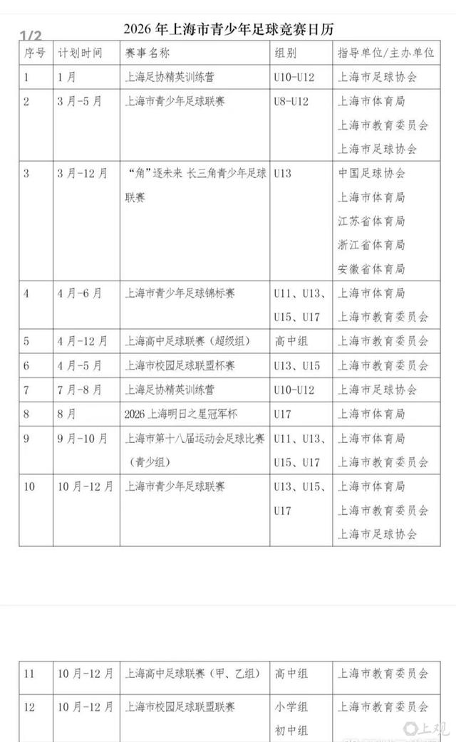 2026年上海市青少年足球竞赛日历发布,其中包括“角逐未来”长三角青少年足球联赛。