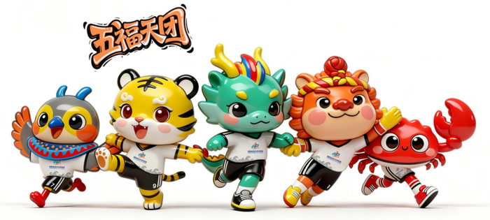 吉祥物:福小龙、福小狮、福小虎、福小蟳、福小雉五只灵兽组成“五福天团”,承载福建各地文化符号与精神内涵,成为赛事萌趣代言人。