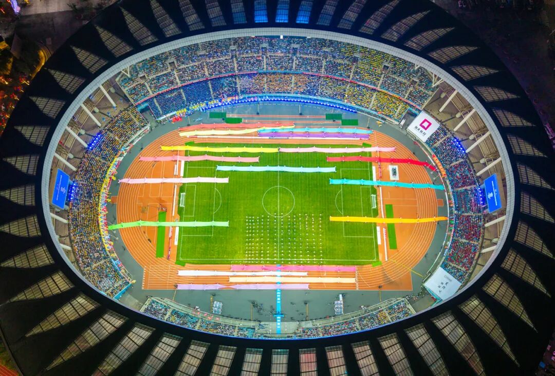 当晚,黄石奥体中心华灯璀璨、人声鼎沸。赛前暖场环节,由“城市发展”“历史文化”“文明新城”“体育运动”四大主题方阵组成的NPC巡游队伍,进行了巡游展演,提前点燃现场气氛。随后的文艺表演,融合了时代、足球、文化、科技与地域五大特色。首篇舞蹈《熔铸》通过灯光秀、裸眼3D效果,营造山脉、铜草花、炉火等环境及场景元素,再融入舞蹈动作,呈现开山寻矿、冶炼铸鼎的劳动场景。第二章情景表演《相逢之山水有约》和《相逢之激情绿茵》兼具视觉震撼与文化厚度,以跨越时空的对话为情感脉络,让当代人物与张志和、苏东坡、张之洞等历史先贤隔空对话,诉说城市文脉传承、赓续地域人文底蕴。并利用裸眼3D效果将湖北省地图呈现于球场上,各市州代表队以“一旗三人一IP”的形式组团进场,展示城市特色元素。第三章歌舞表演《逐梦》,现场演绎本届“楚超”会歌《足梦湖北》,17条巨型彩绸自观众席奔腾而下,汇聚成浩荡的长江意象舞动全场,寓意全省17城同心聚力、共赴盛会,凸显万民欢乐、全民参与的体育精神,将开幕式气氛推向最高潮。