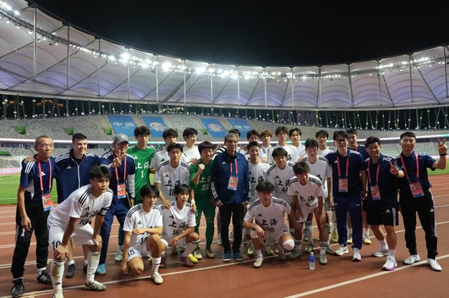 2025年11月12日,上海队成员在赛后合影留念。 当日,在深圳进行的第十五届全国运动会足球项目男子20岁以下组铜牌赛中,上海队通过点球大战5比4战胜山东队,获得铜牌。 新华社记者 丁增尼达 摄