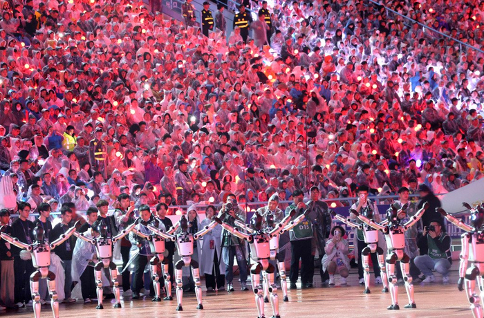 新赛季的苏超开幕式放在了常州举行,开场特邀嘉宾周深演唱了包括苏超主题曲《热烈盛开》在内的三首歌曲。与此同时,在常州奥林匹克体育中心体育场,代表着“十三太保”的13幅飞天屏悬挂于夜空,300台机器人构成的表演规模则创下行业纪录。此外,还有40辆卡丁车助阵表演。