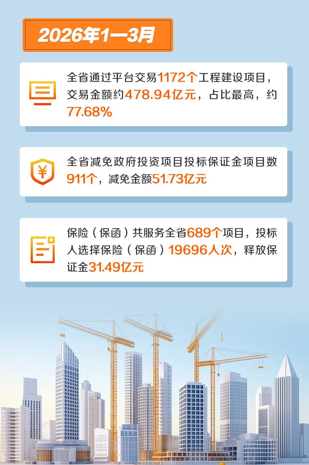 2026年1—3月,全省通过云南省公共资源交易平台交易1849个项目,投标参与28581人次,交易完成金额616.58亿元;通过云南省公共资源交易平台完成远程异地评标1315个项目(其中104个隔夜评标项目),投标参与26793人次,交易完成金额556.29亿元。