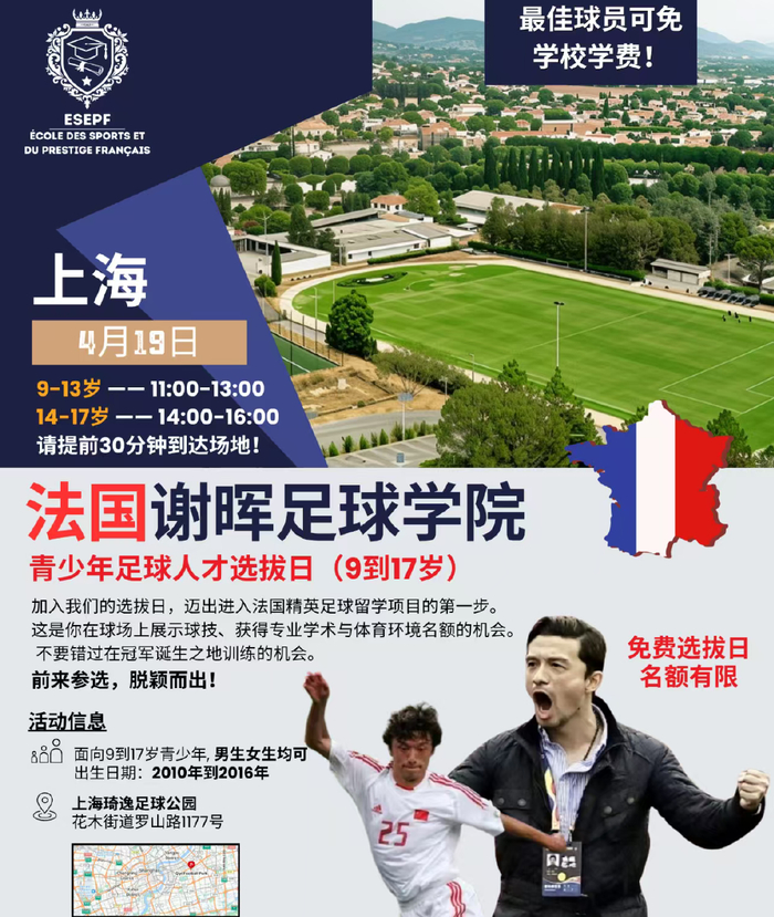 是的,经过此前的筹备,谢晖成立了法国谢晖足球学院,根据介绍,该学院在法国的卢瓦尔河地区、波尔多地区、普罗旺斯地区都有自己分院,谢晖将按照法国顶级青训中心模式打造,专注高水平培养、纪律素养和竞技表现,该学院的学生不仅可以得到相应的文凭,还可以得到推荐进入法国足球梯队的机会,值得一提的是,此次选择的最佳球员将全程免学费留洋。
